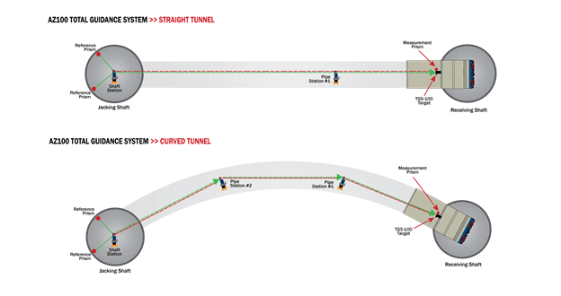 Developed by Akkerman to support long-distance and curved pipe jacking, the AZ100 TGS is a self-surveying azimuth-based total guidance system. The AZ100 TGS minimizes errors often encountered with other types of guidance systems due to laser deflection or MTBM drift. Using fixed reference prisms or “azimuths” strategically located on the launch shaft, a “shaft station” communicates with self-leveling total stations via prisms inside the tunnel. Positioned at a fixed distance from the MTBM to eliminate refraction from atmospherics, an MTBM “pipe station” projects a laser onto the MTBM target allowing the operator navigation control. During this operation, the series of total stations communicate at regular intervals while referencing their position to the azimuths each time. This ensures line and grade accuracy at extremely long distances or complex alignments.